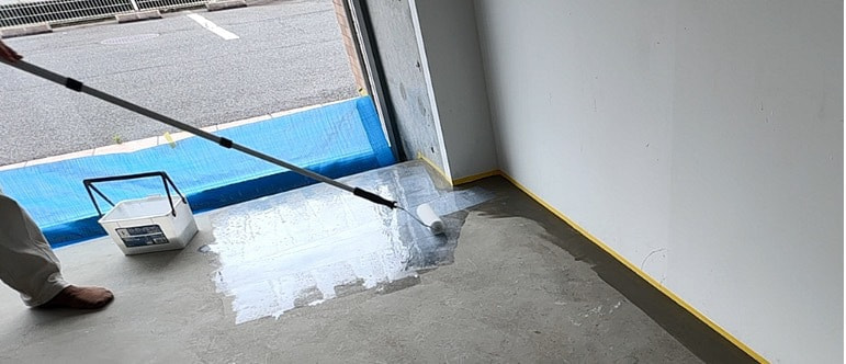 広い面はローラーで塗り、壁際などのシーラーが付着すると困る箇所は先端の細い刷毛で丁寧に塗布してください。ローラーで隅も塗ろうとすると養生をしていてもテープの隙間から浸透する事があります。